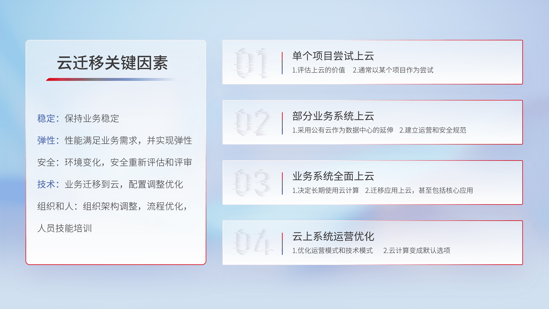 结合实际业务,,从规划设计、、、、云平台选型、、云原生改造、、、数据迁移、、、、集成交付,,,迁移全过程为客户识别最佳上云路径,,,,做好风险识别管理,,,,设计网络架构、、身份权限、、、、安全审计合规、、、操作审计、、、日志审计、、监控告警策略、、、多站点容灾设计等,,,对云上基础设施进行整体规划,,提升IT治理水平,,以满足弹性、、高可用、、、高性能的需求。。。。