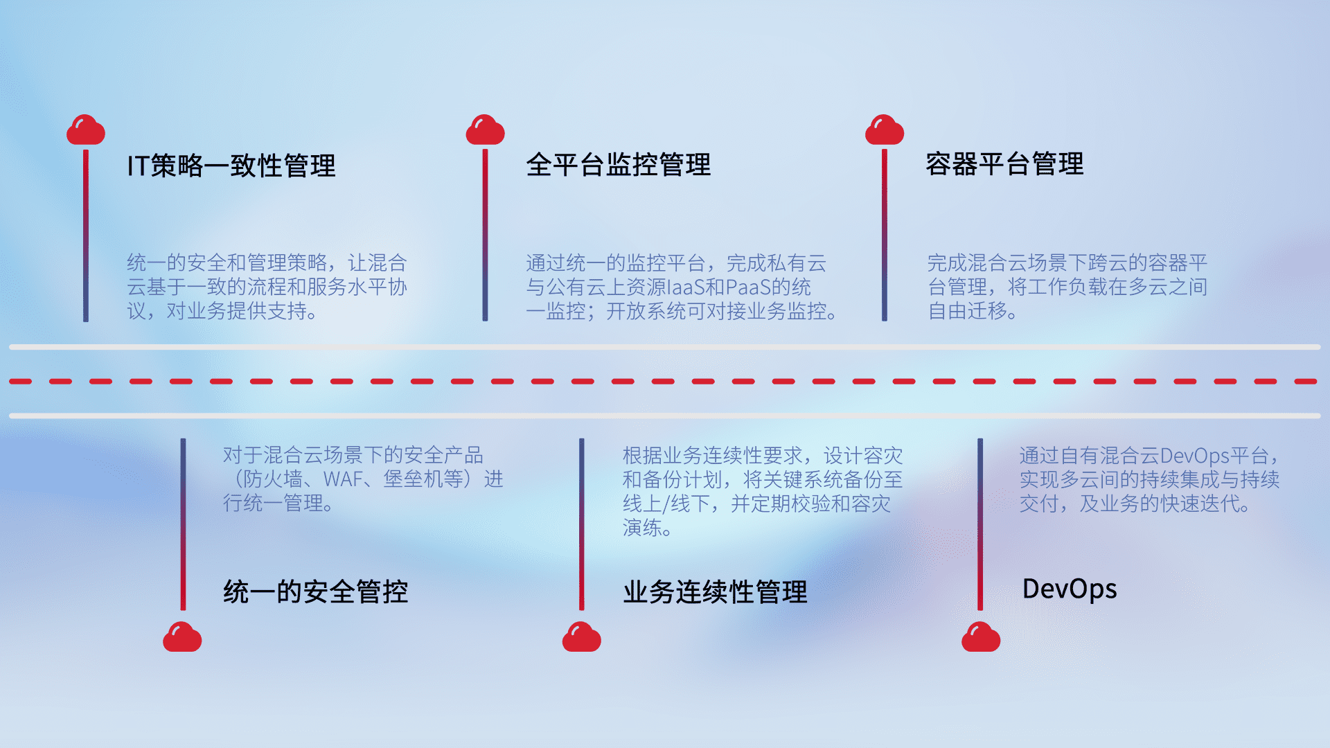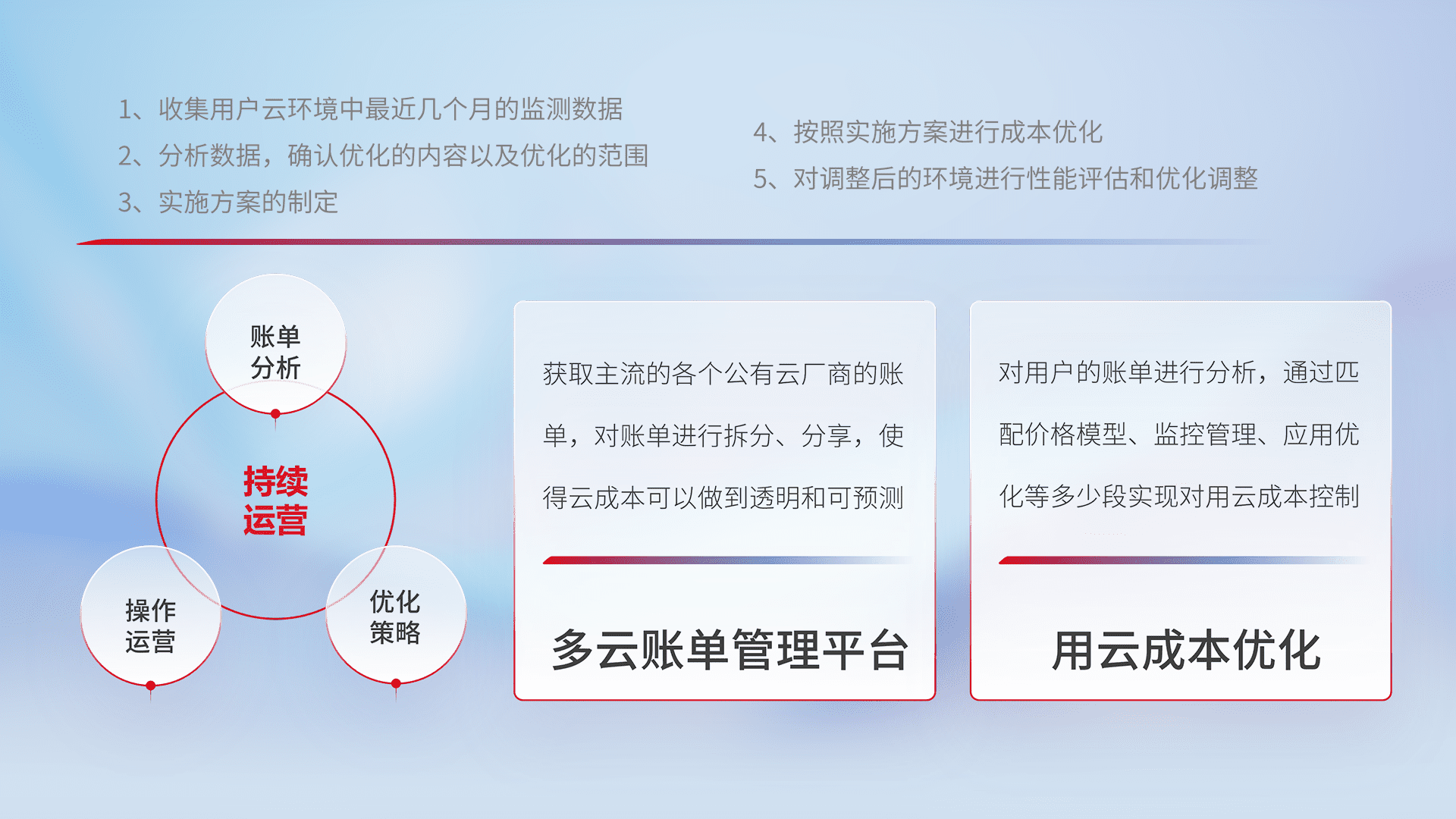 通过多云纳管,,以统一的资源数据模型把客户的云资源进行抽象和封装,,,进而实现对多云资源的统一操作,,保障云资源管理的可靠性、、、稳定性与可用性。。。。量身定制化运维内容,,,,配置、、、开发运维、、、补丁管理、、、备份、、、、监控、、认证和访问管理、、审计和日常巡检等,,,,保障在用云过程中的可靠度,,稳定度以及高可用率。。。。