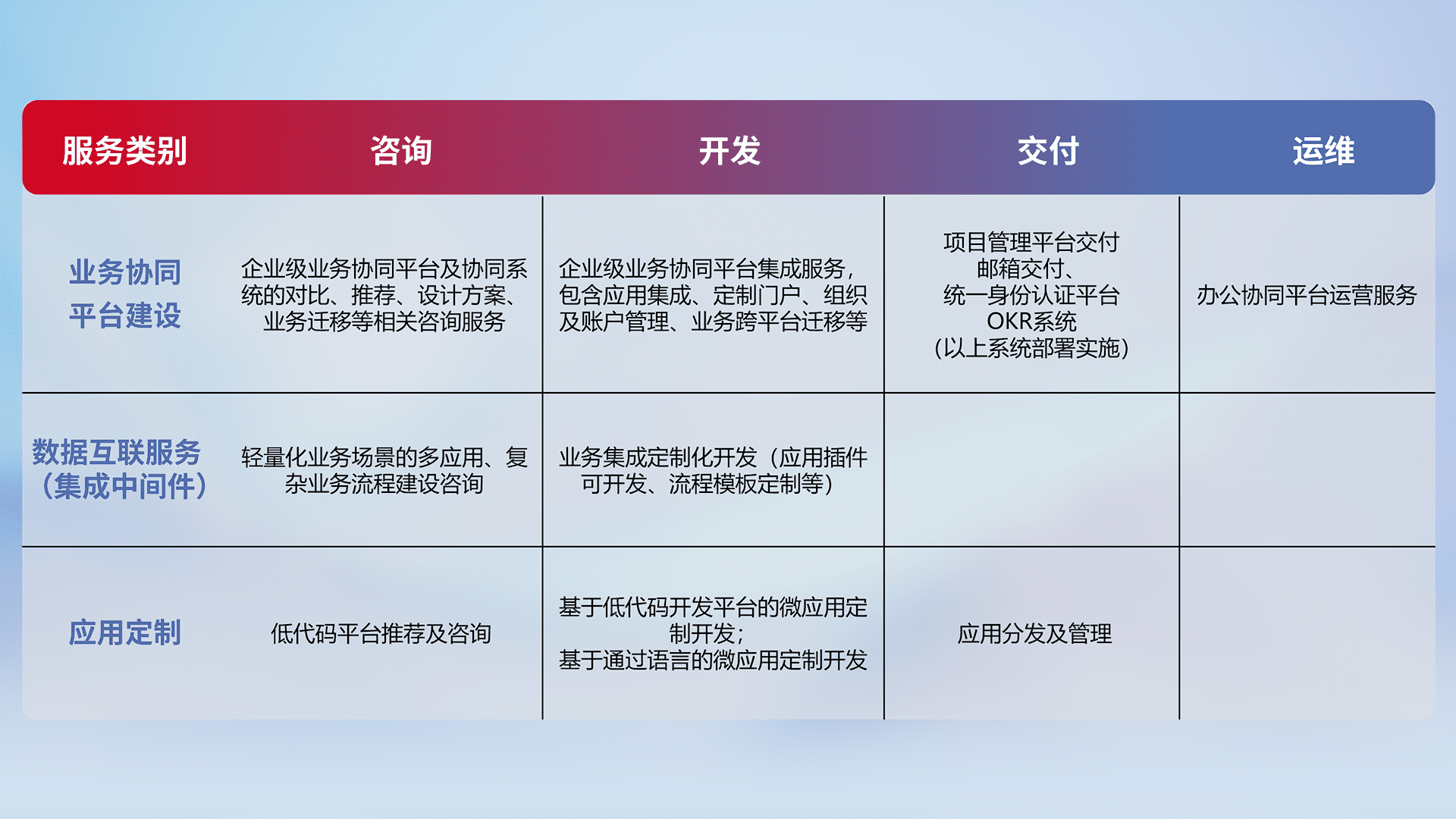 针对钉钉、、企微、、、IDaas等平台级产品提供产品的规划、、、方案、、、交付、、、、定制化开发等服务,,,,实现如统一协同办公、、、、智能客户服务、、、混合会议管理、、、智能数据查询、、等业务场景,,实现数字化转型。。。